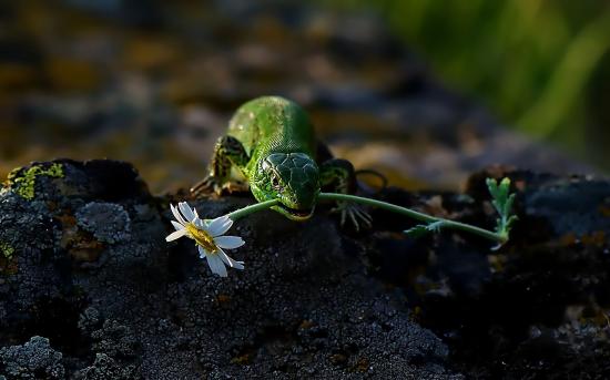 Обои Ящерица с ромашкой