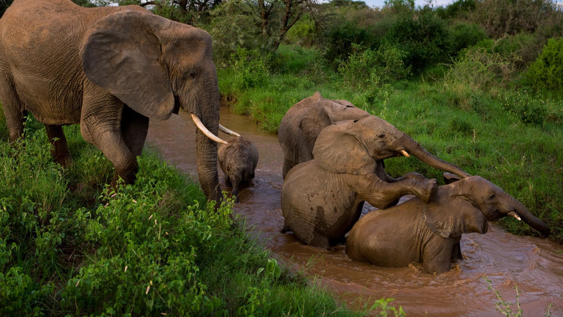 Обои Семья слонов купается