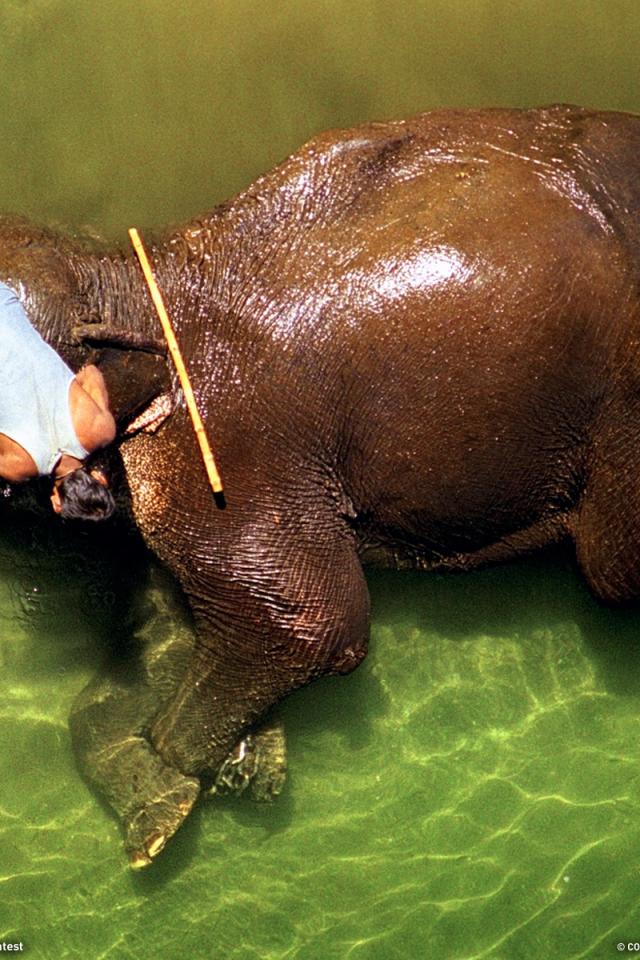 Обои Погонщик моет слона