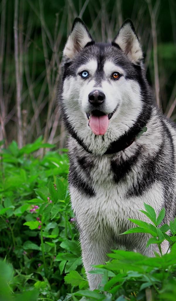 Обои Хаски с разными глазами среди травы