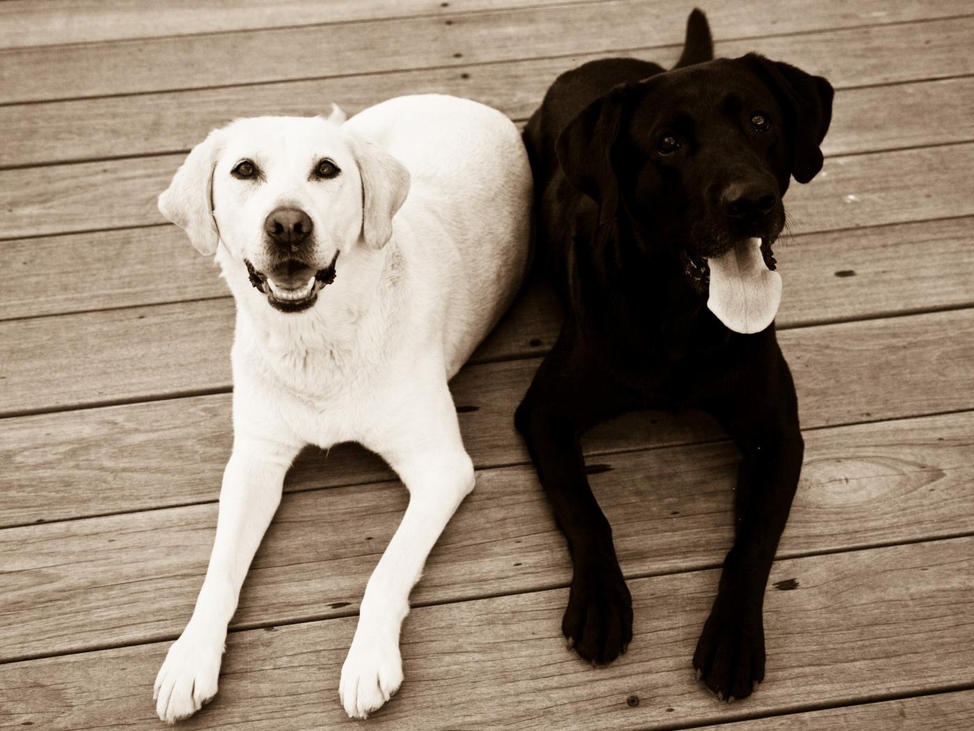 Обои Черная и белая собака на полу
