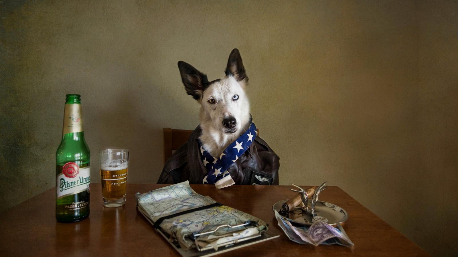 Обои Собака за столом с пивом