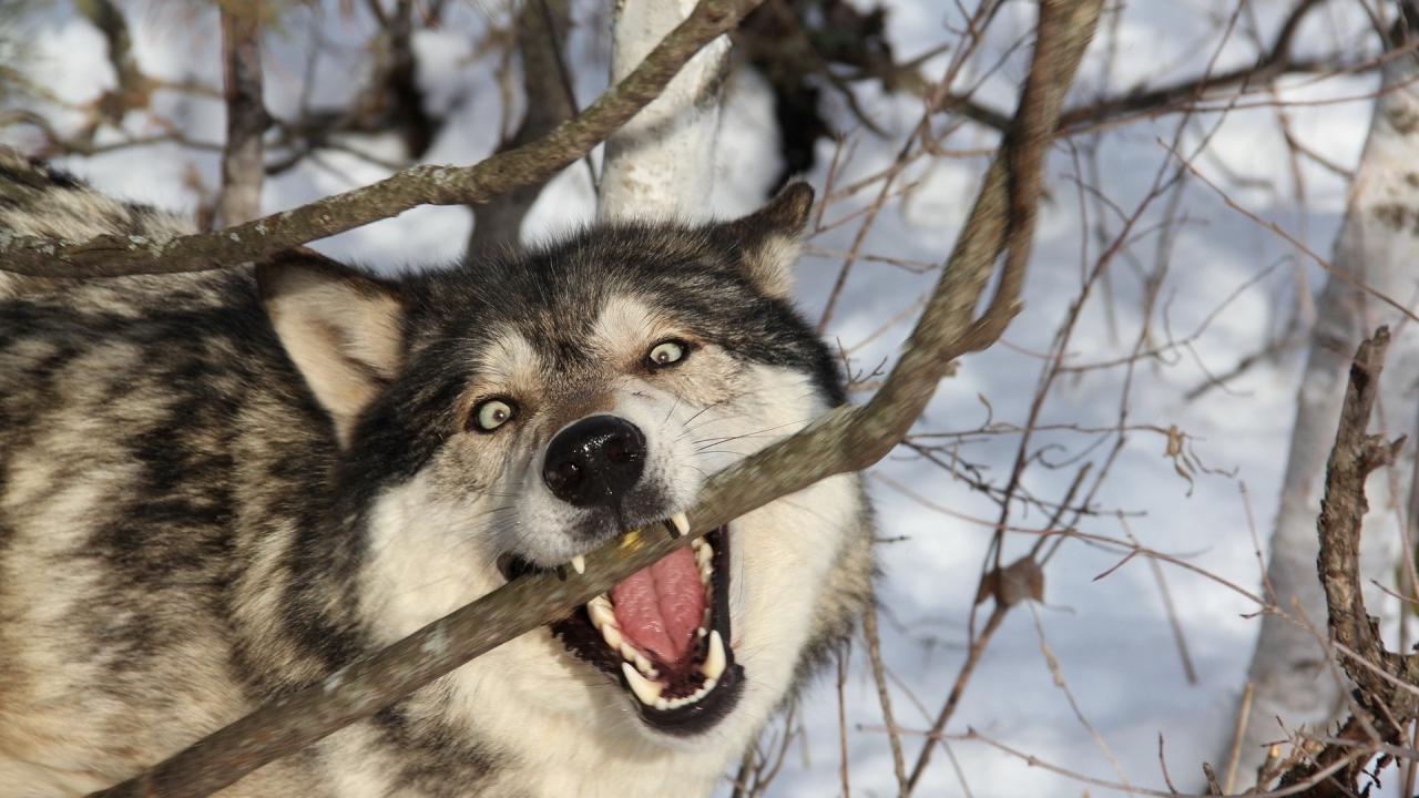 Обои Собака кусает ветку в лесу