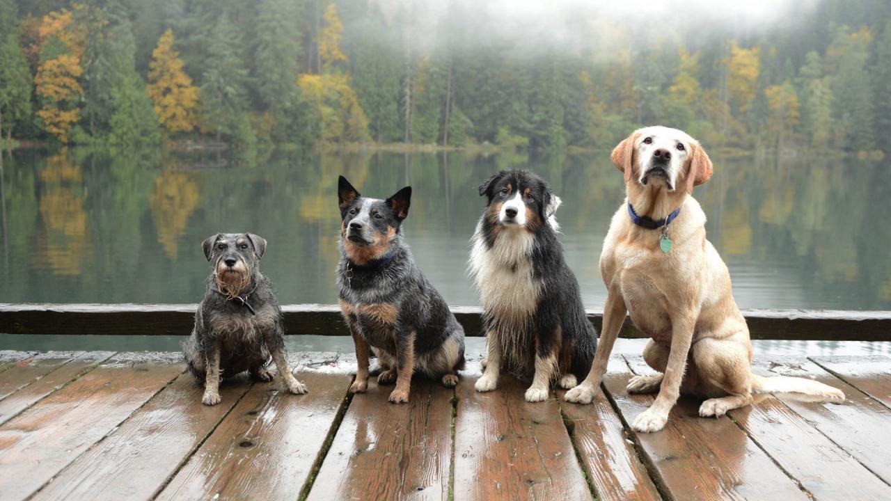 Обои Собаки сидят на деревянном помосте у водоема