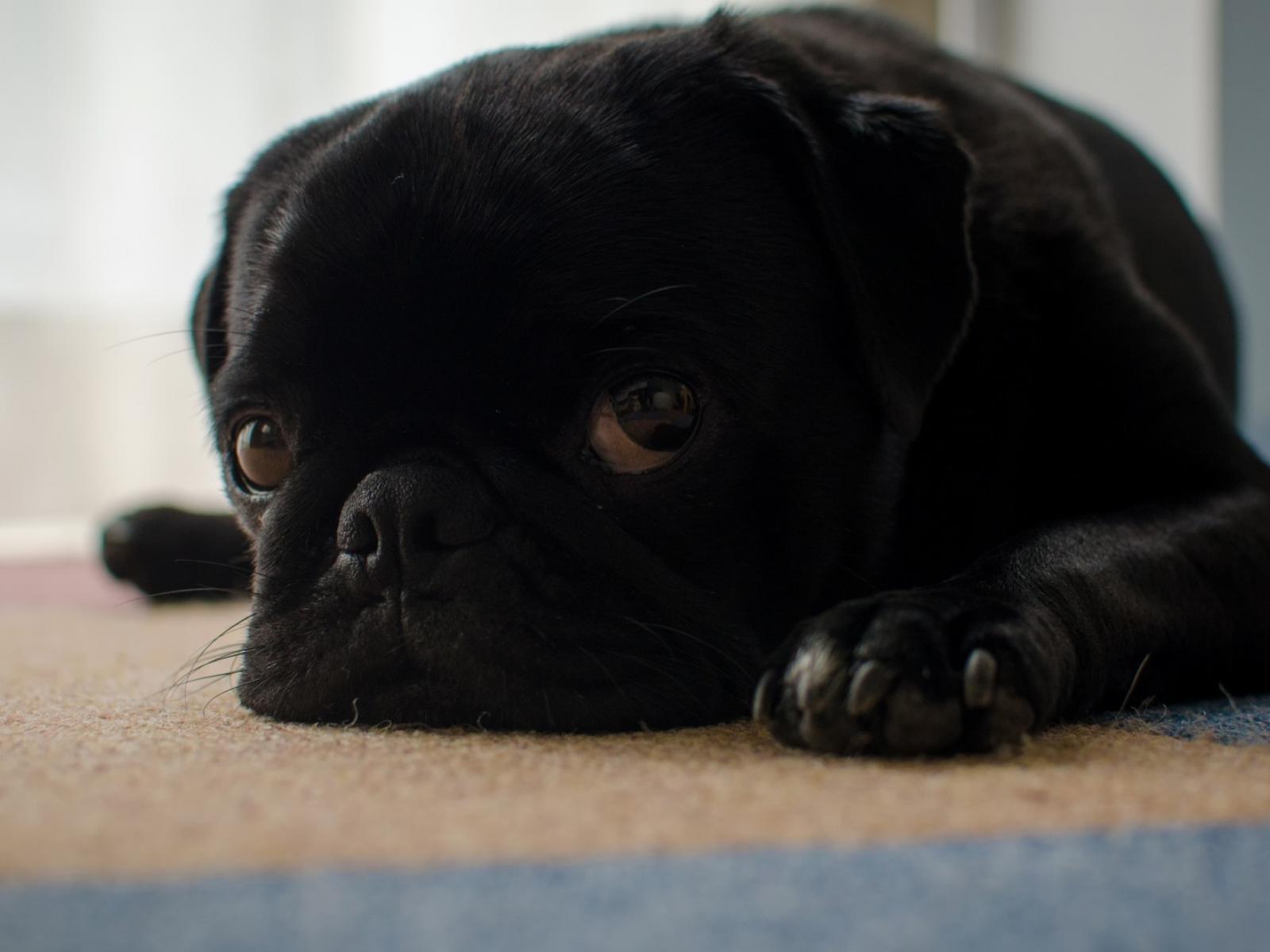 Обои Грустный черный щенок мопса лежит на полу