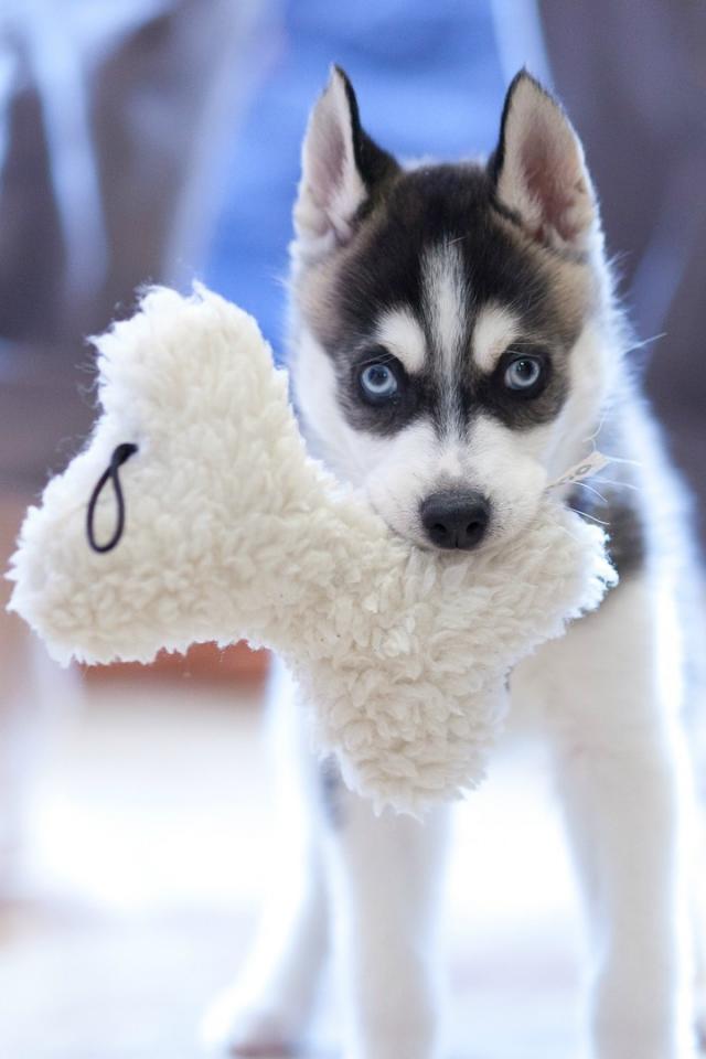 Обои Маленький хаски с игрушкой в зубах