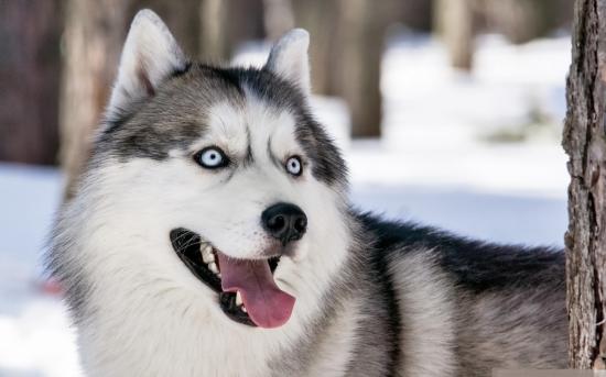 Обои Собака хаски в зимнем лесу