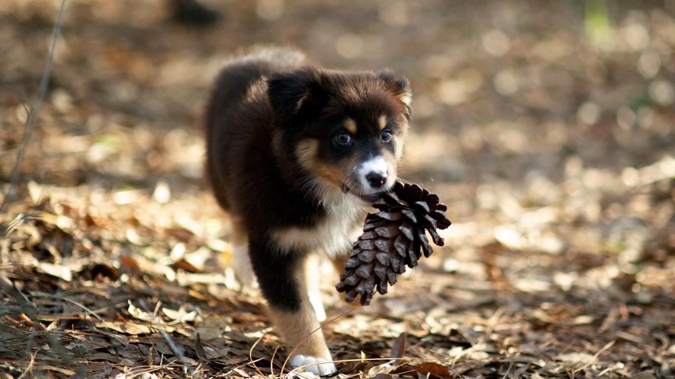 Обои Щенок несет шишку