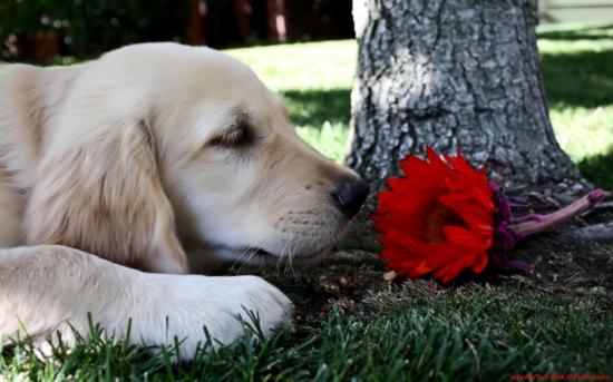 Обои Собака нюхает цветок