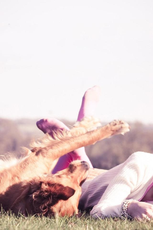 Обои Девушка играет с собакой
