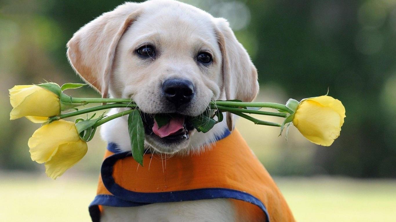 Обои Щенок дарит жёлтые розы