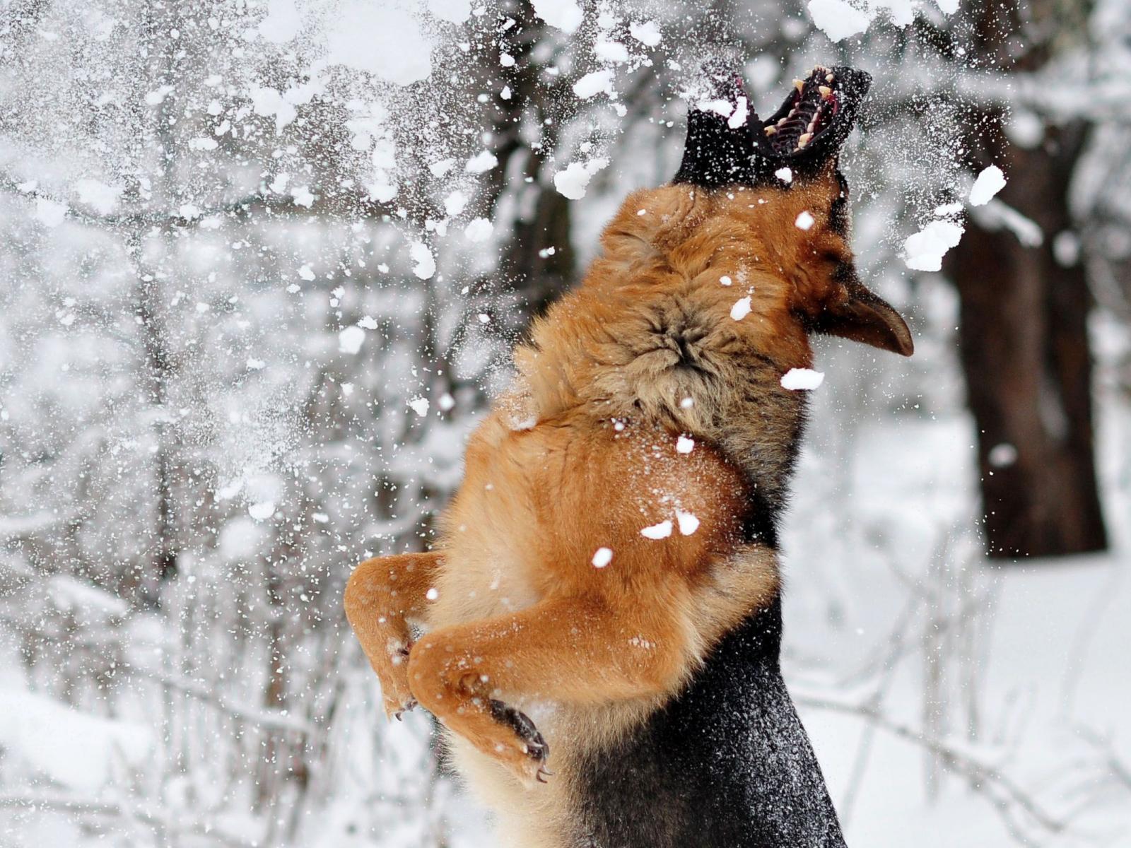 Обои Собака ловит снег