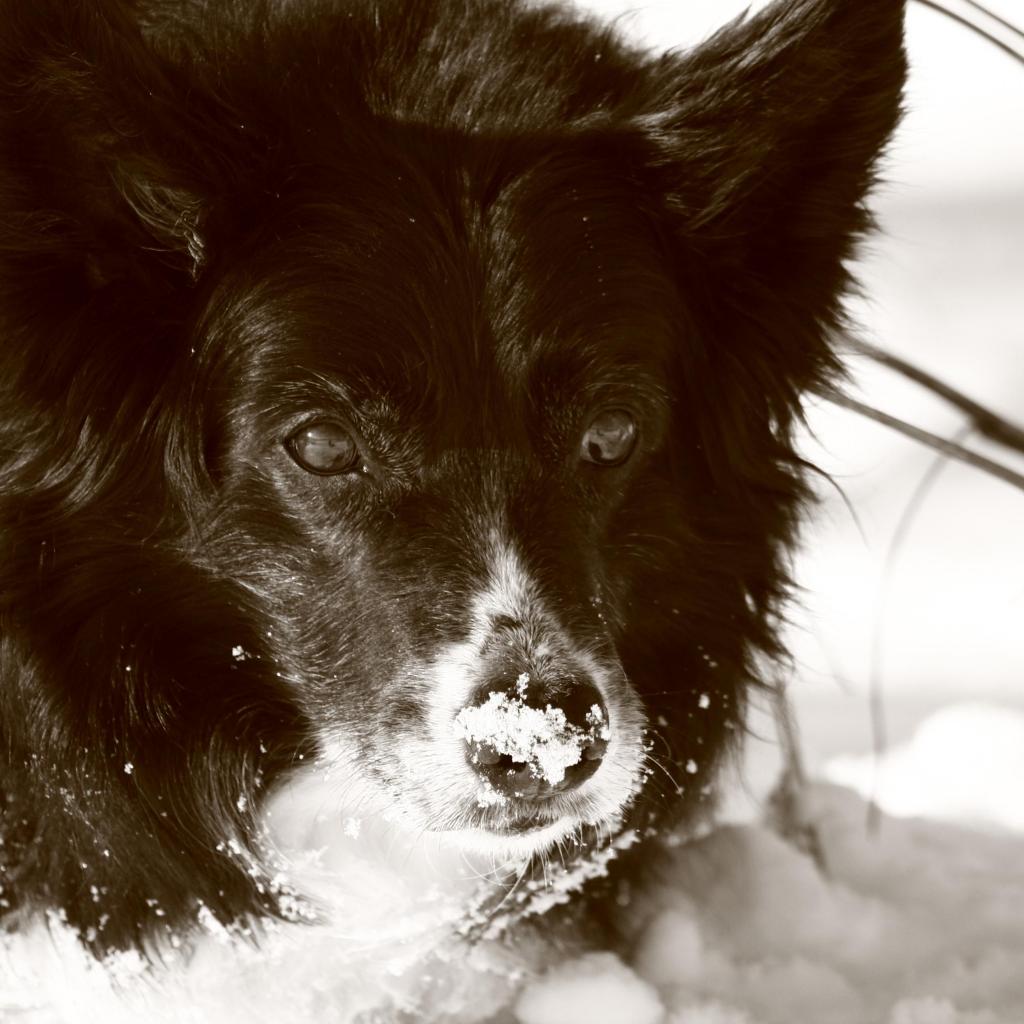 Обои Грустная бордер-колли зимой в сугробе