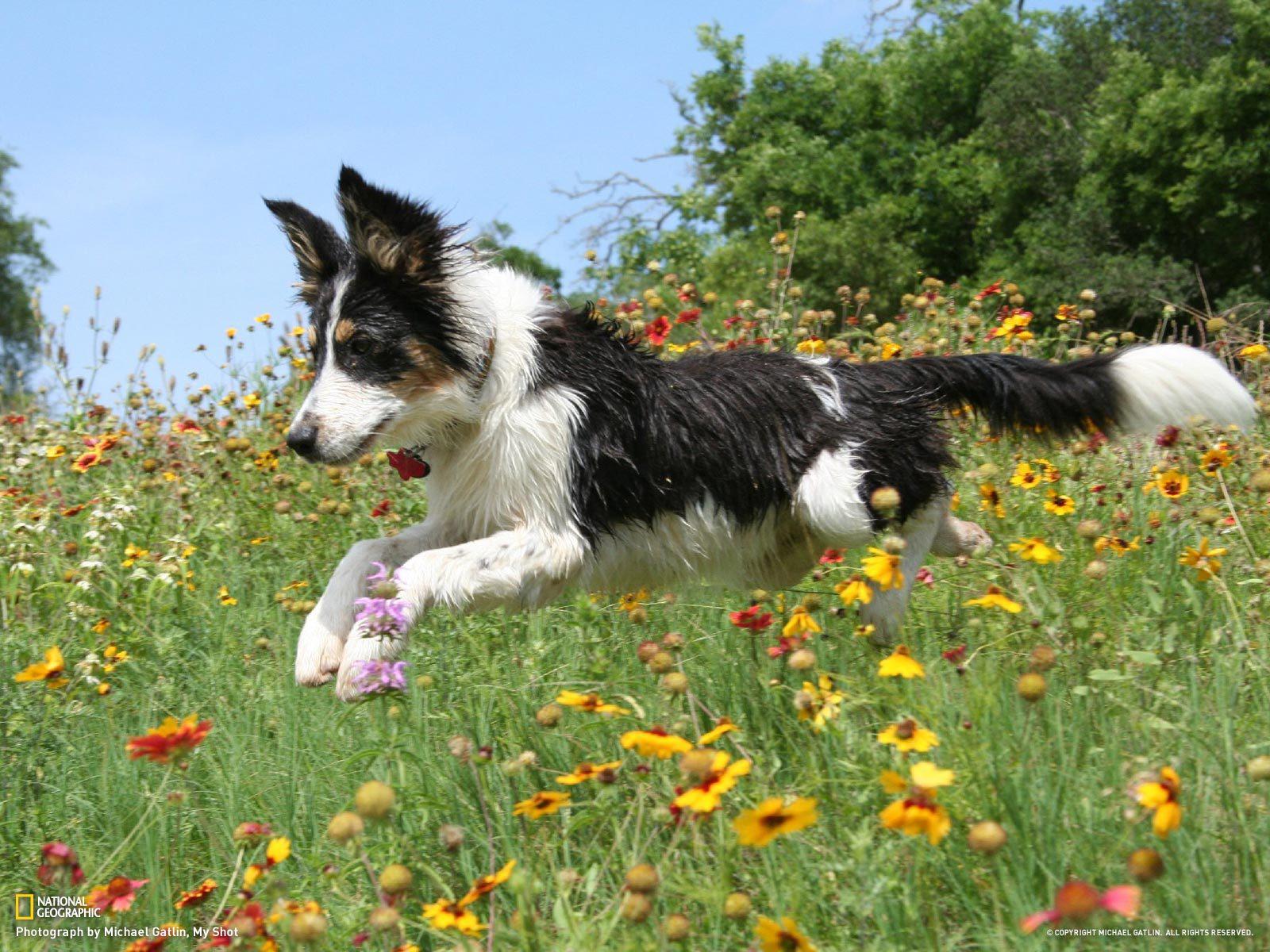 Обои Счастливая бордер-колли бежит по цветочной поляне