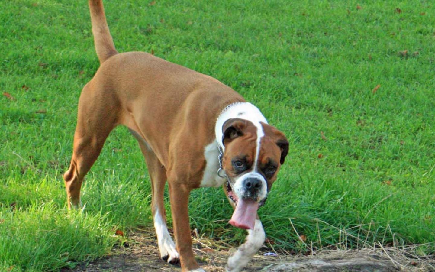 Обои Боксёр с длинным языком гуляет по траве