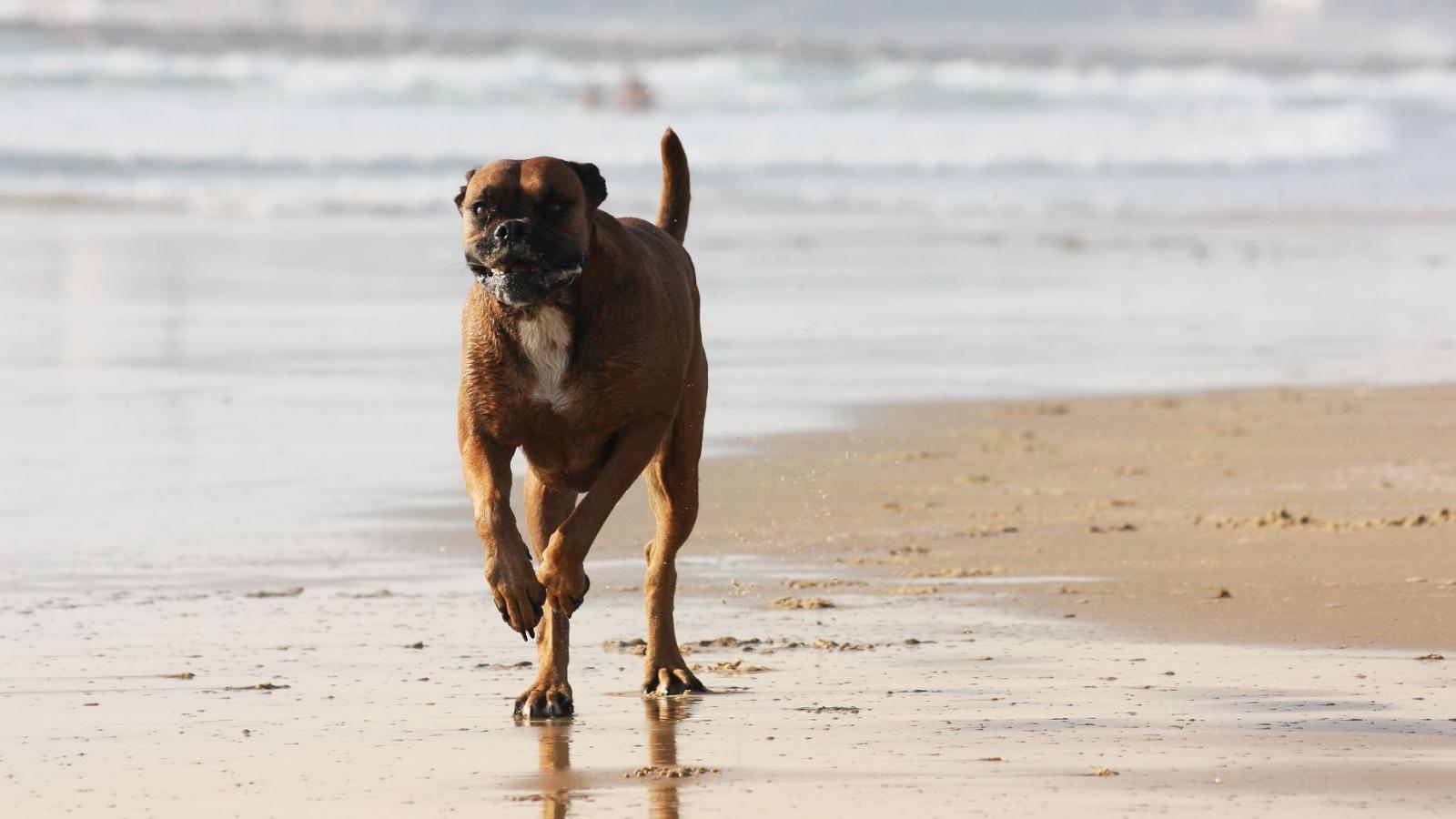 Обои Счастливый боксёр бежит по берегу моря