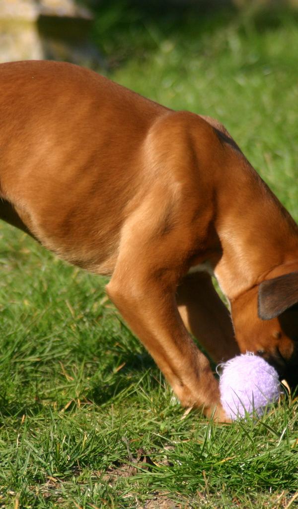 Обои Молодой боксёр грызёт игрушку
