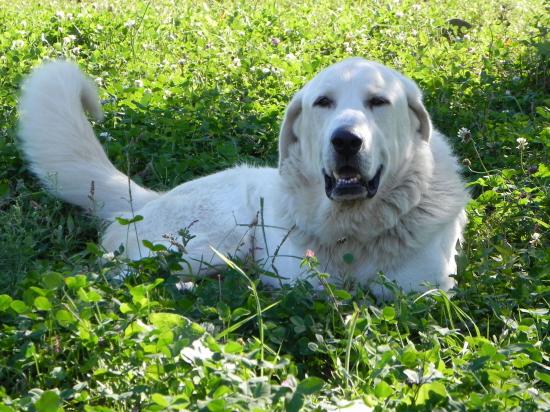 Обои Большая пиренейская собака отдыхает на траве