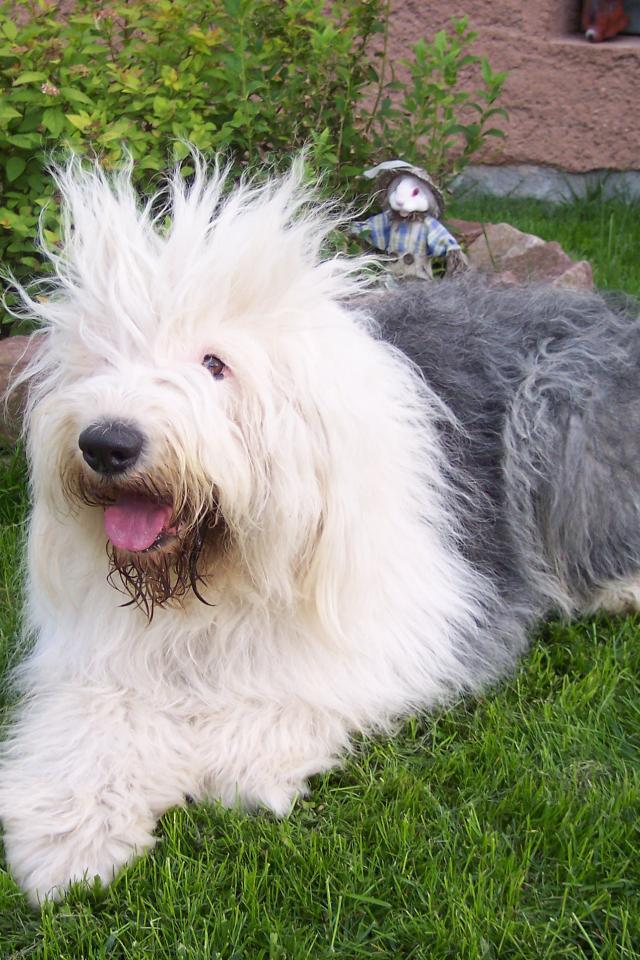 Обои Собака породы бобтейл стоит на лужайке