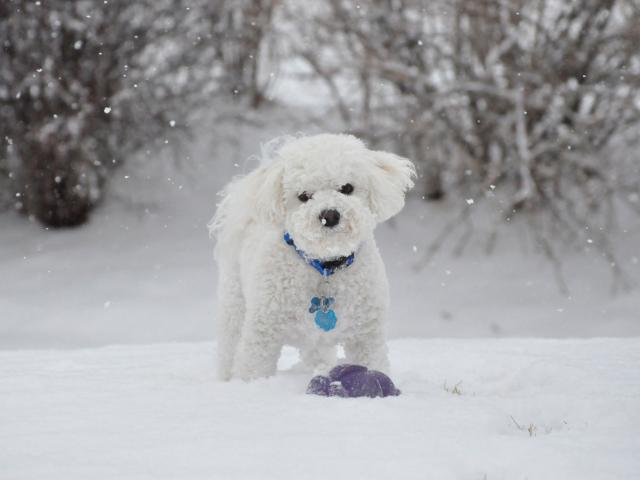 Обои Красивая собака породы бишон-фриз зимой на прогулке