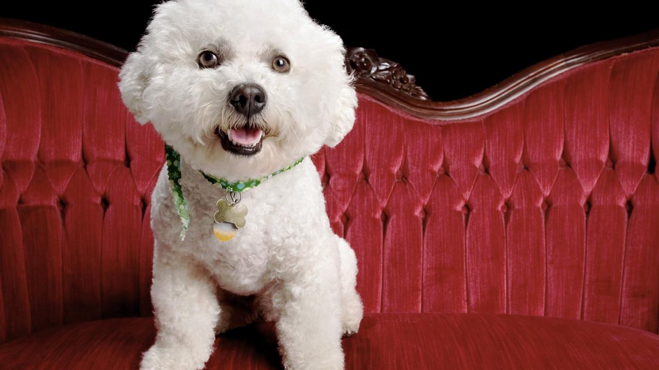 Обои Собака породы бишон-фриз на красном диване