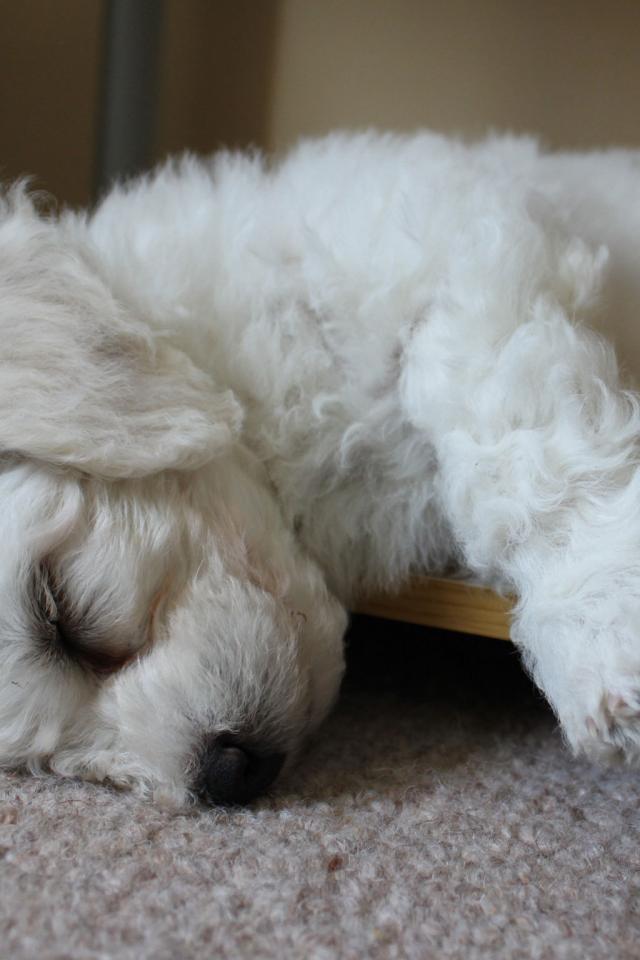 Обои Щенок породы бишон-фриз лежит на белой постели