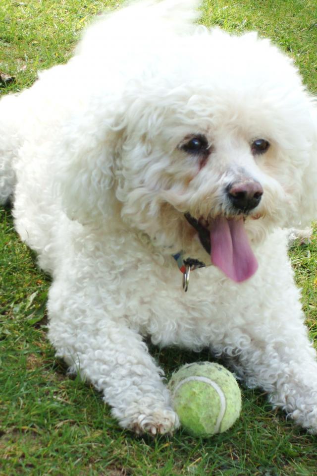 Обои Собака породы бишон-фриз лежит на лужайке с мячом