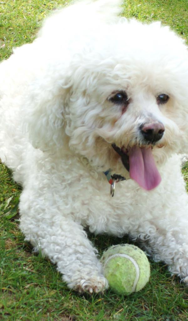 Обои Собака породы бишон-фриз лежит на лужайке с мячом
