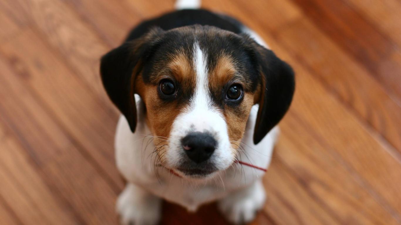 Обои Собака породы бигль смотрит на фотографа