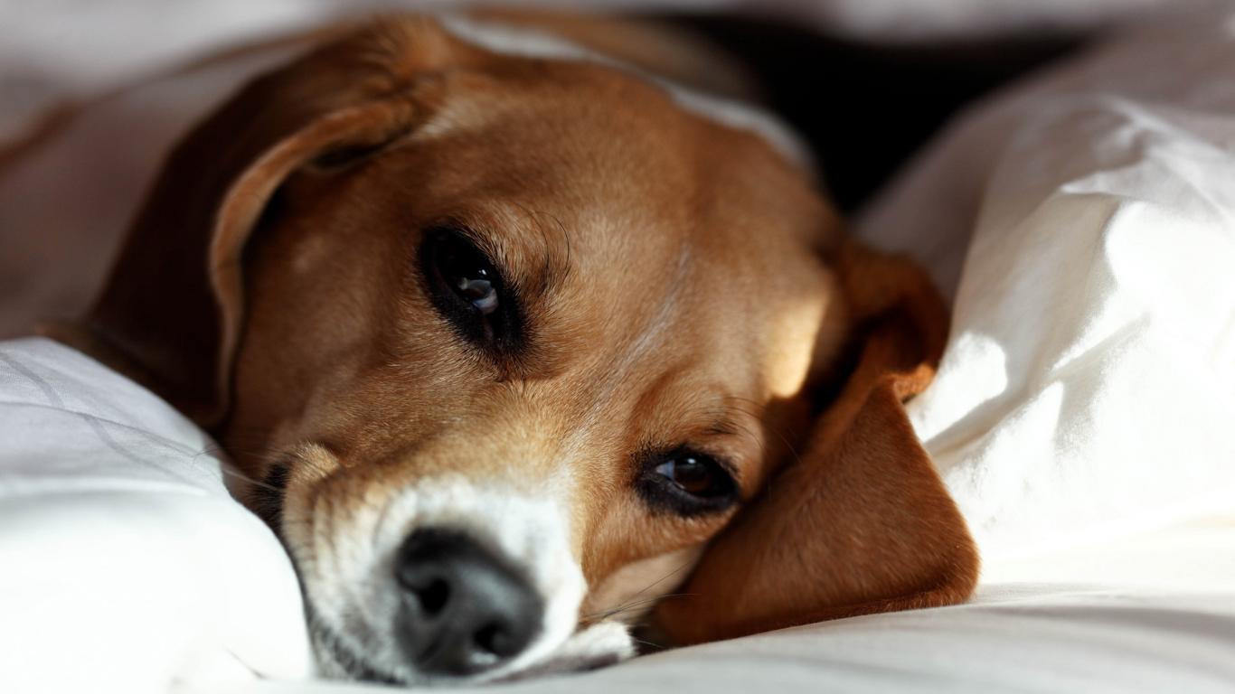 Обои Собака породы бигль отдыхает на хозяйской кровати