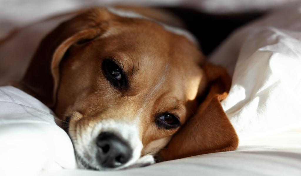 Обои Собака породы бигль отдыхает на хозяйской кровати