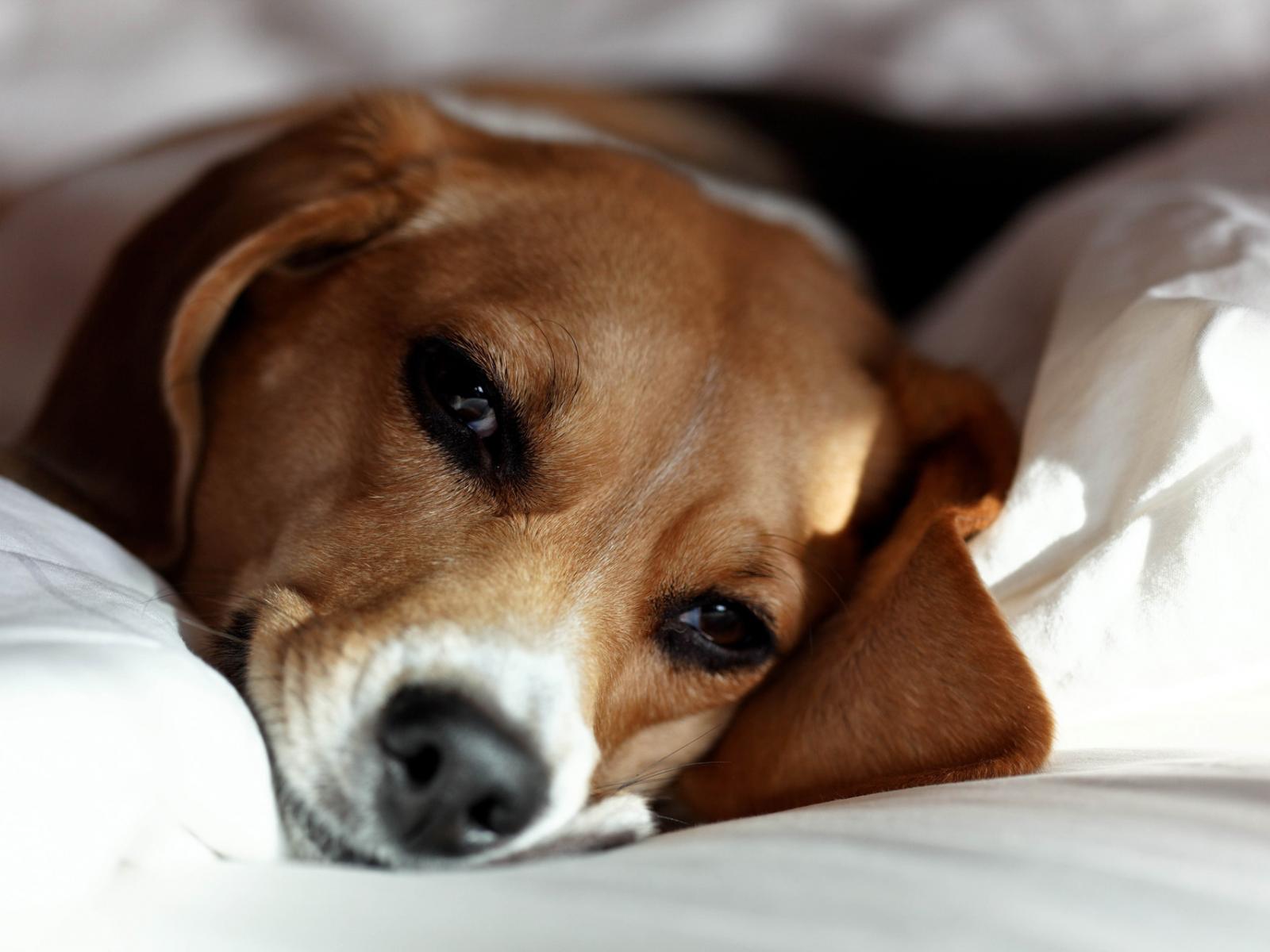 Обои Собака породы бигль отдыхает на хозяйской кровати