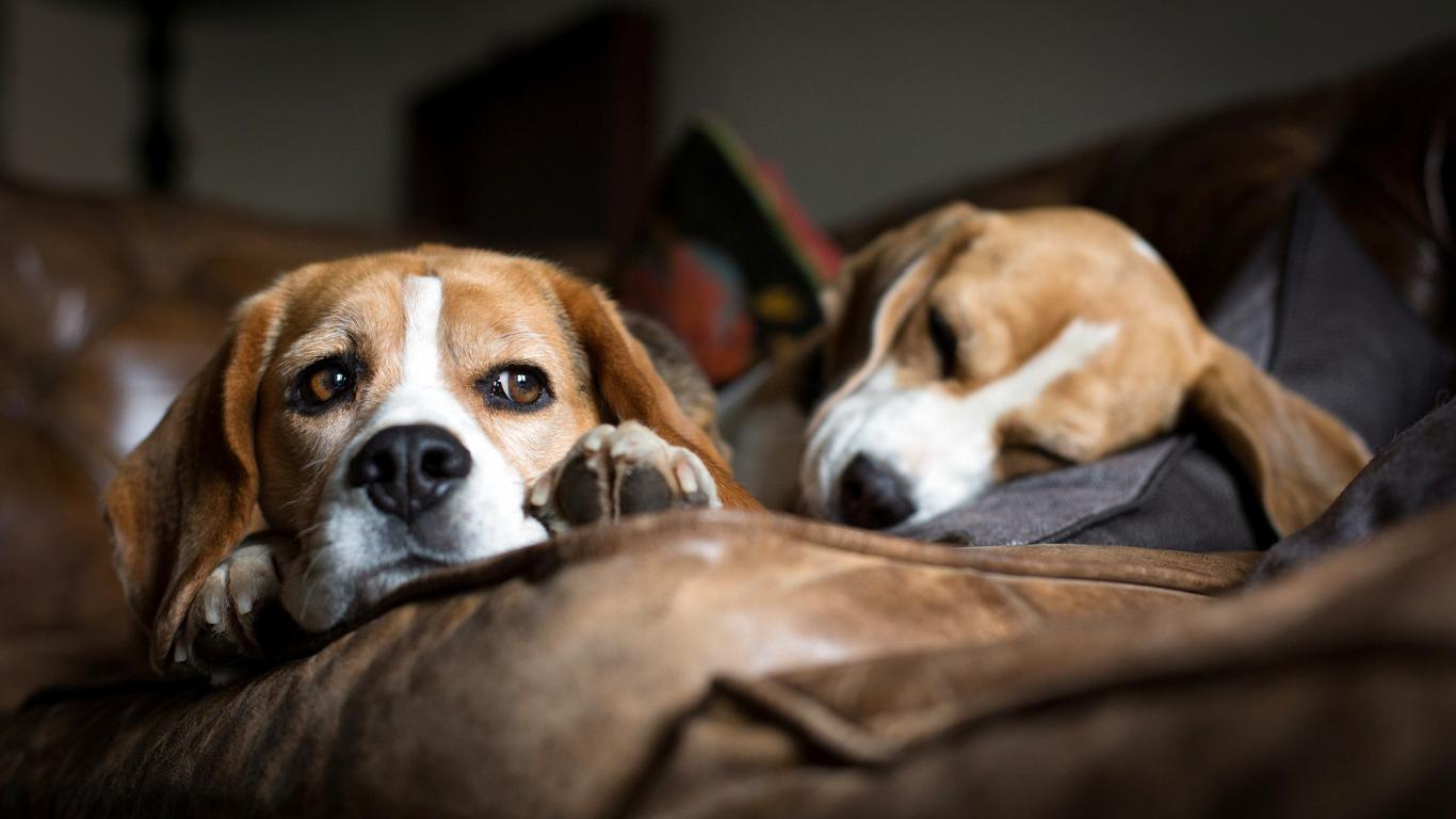 Обои Собаки породы бигль отдыхают на коричневом диване