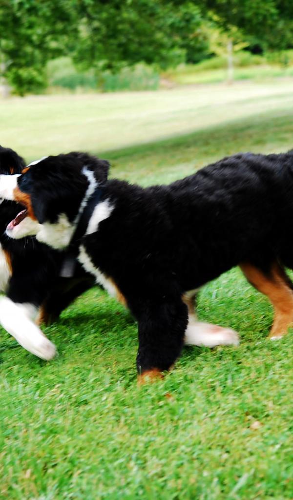 Обои Счастливые щенки бернской пастушьей собаки играют