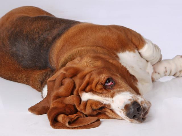 Обои Смешной бассет-хаунд развалился на полу