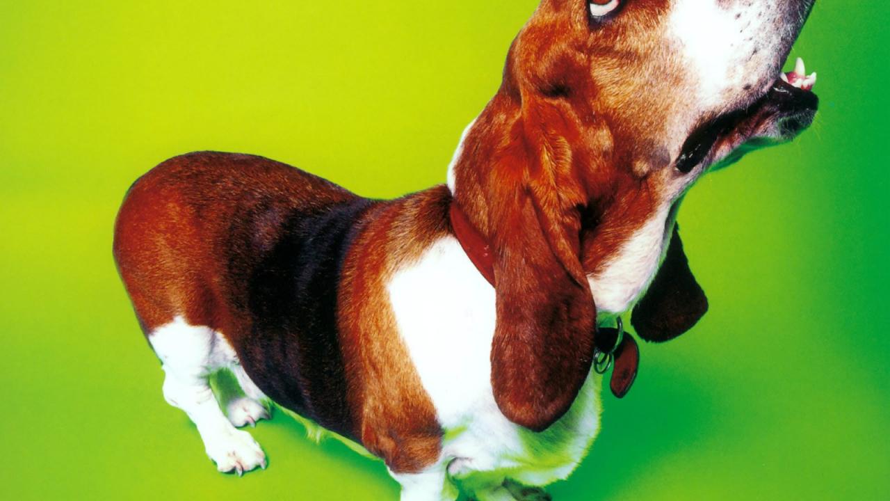 Обои Смешной бассет-хаунд на зелёном фоне