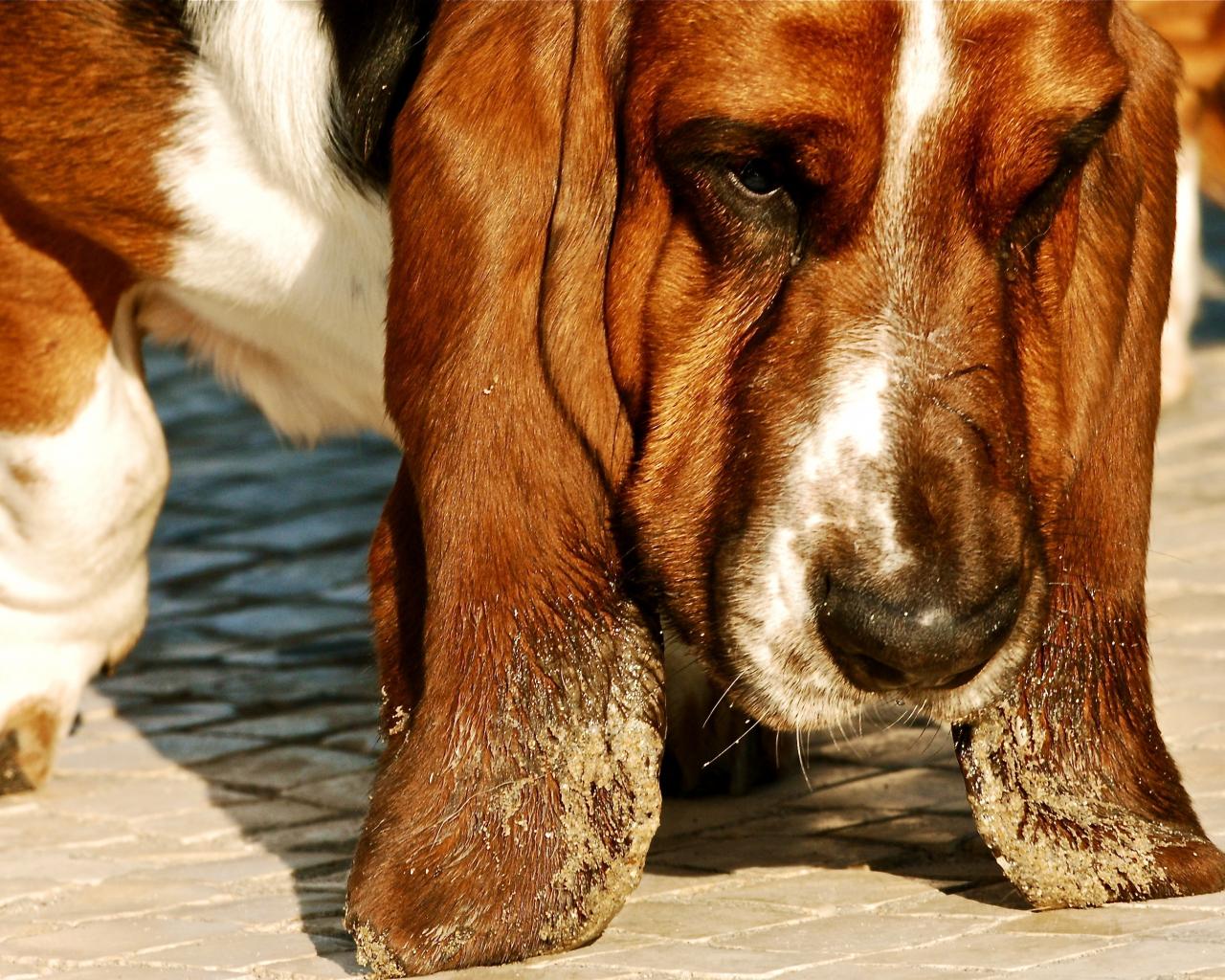 Обои Бассет-хаунд испачкал уши в песке