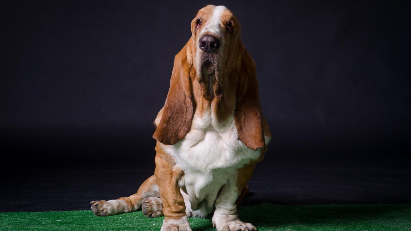 Обои Взрослый бассет-хаунд позирует на тёмном фоне