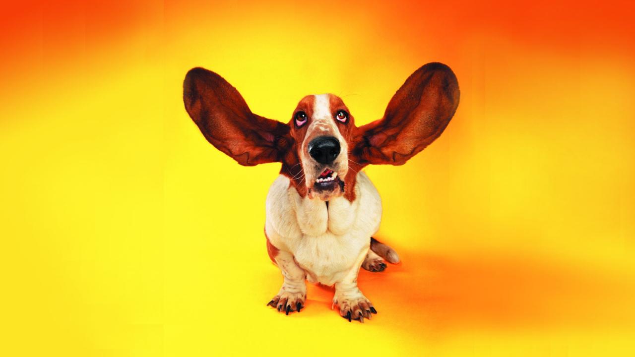 Обои Смешной бассет-хаунд на оранжевом фоне