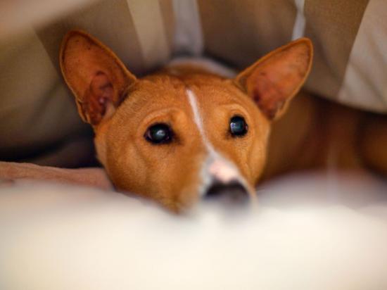 Обои Собака породы басенджи спряталась под одеялом