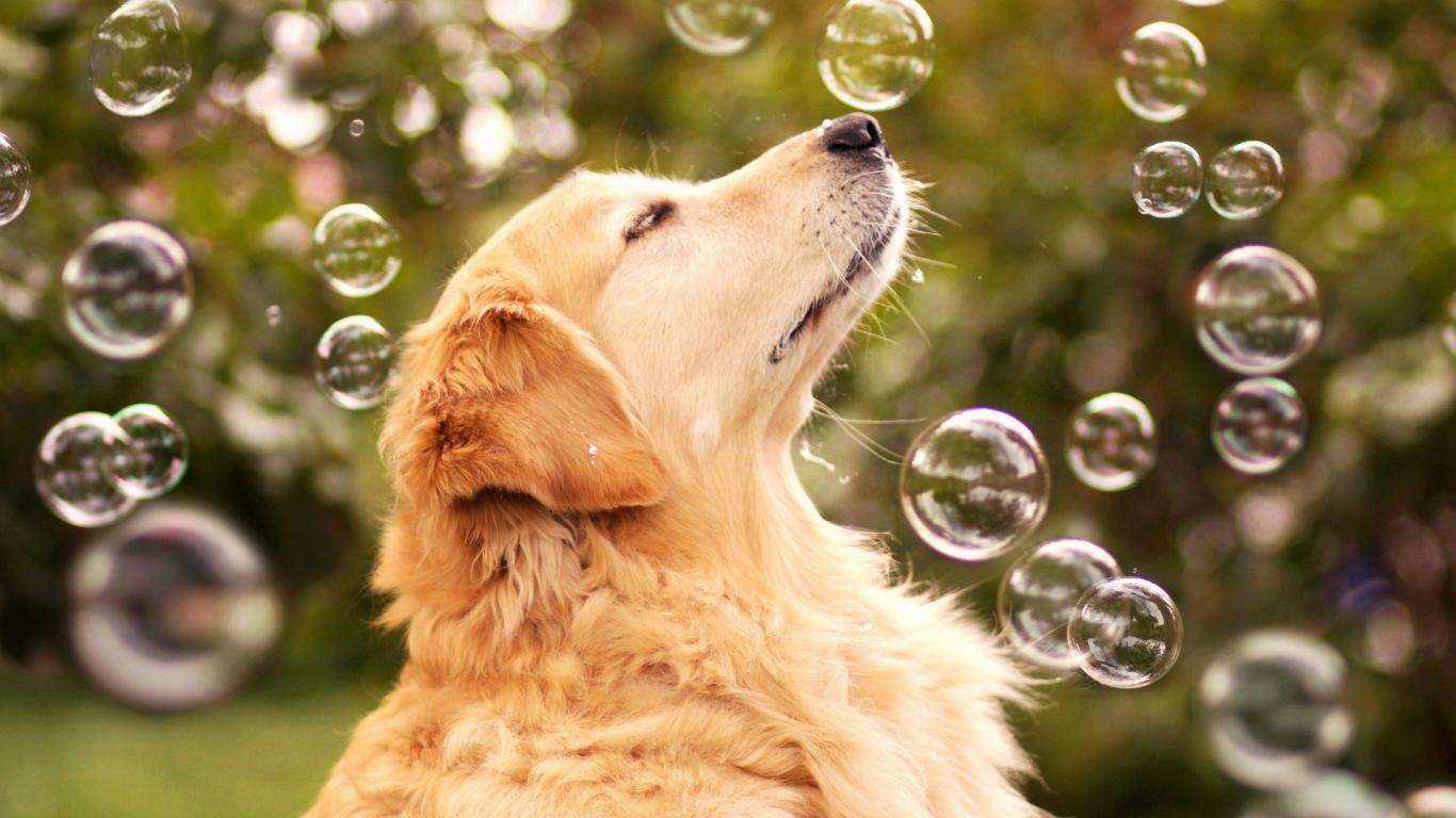 Обои Собака ловит мыльные пузыри