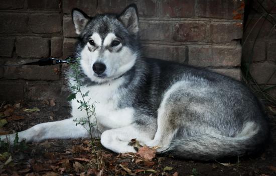 Обои Грустный аляскинский маламут лежит на земле