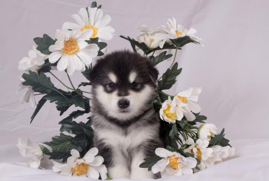 Обои Маленький аляскинский маламут в цветах