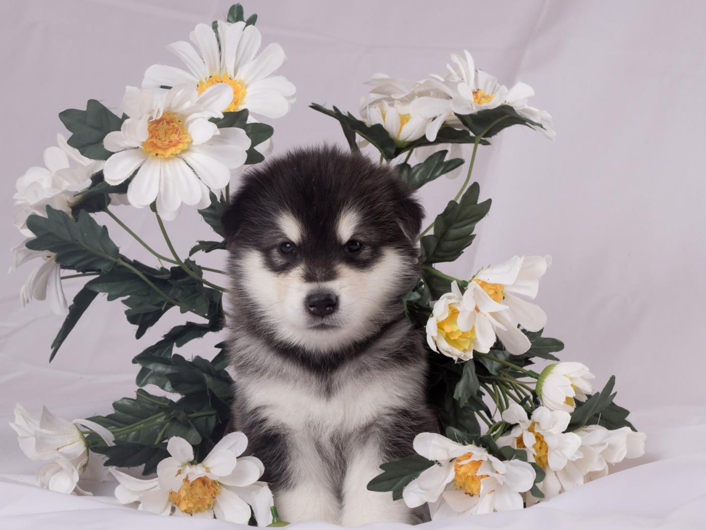 Обои Маленький аляскинский маламут в цветах