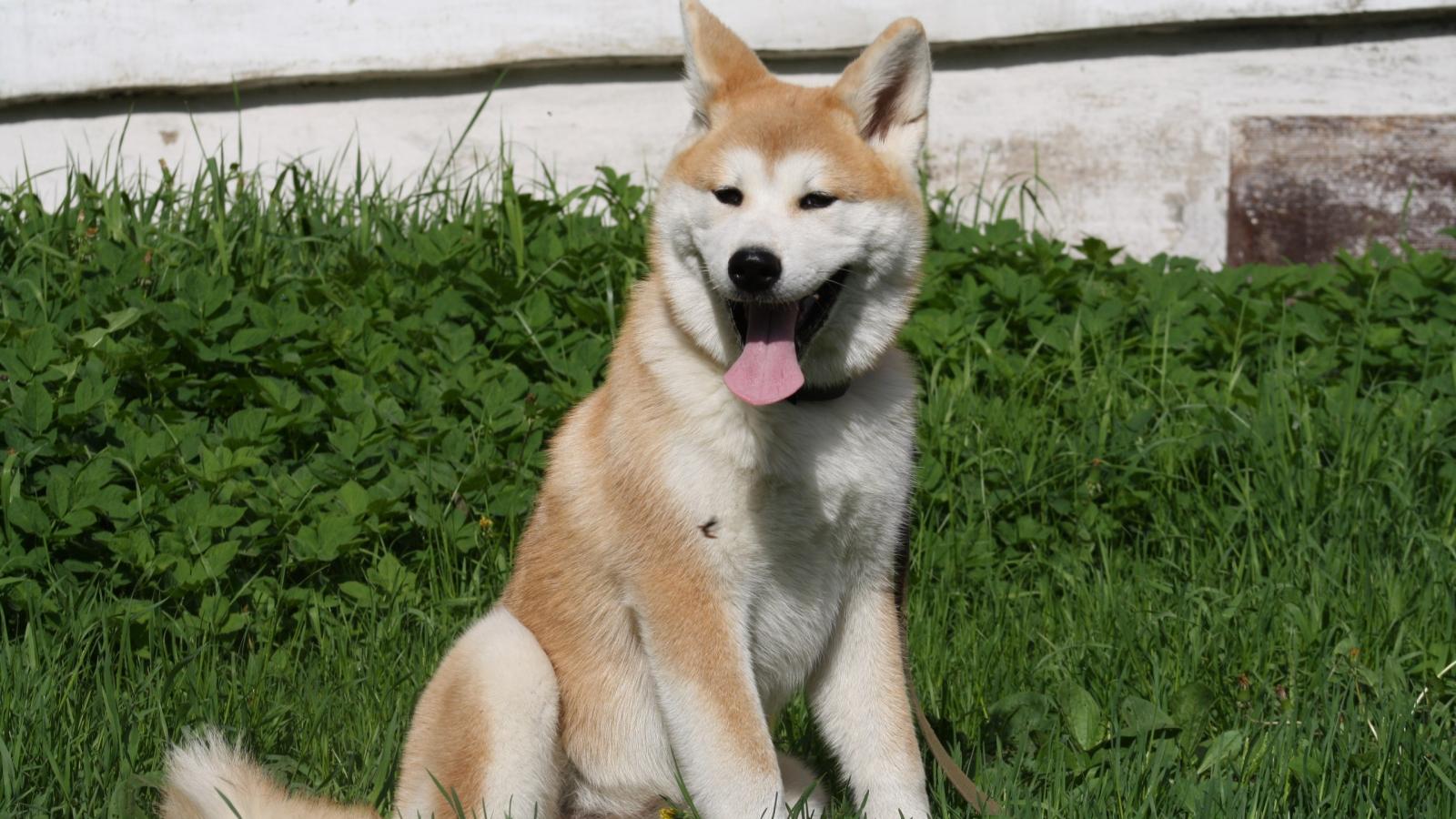 Обои Уставшая акита-ину на траве
