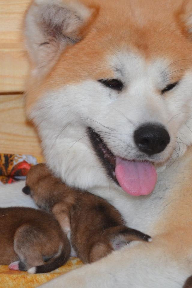 Обои Взрослая акита-ину и её щенки