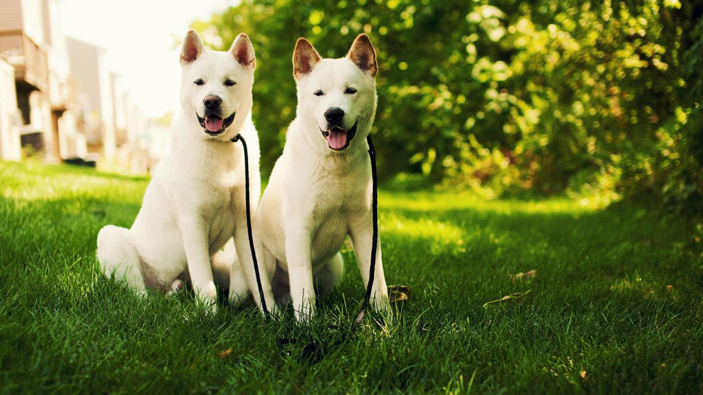 Обои Две белые собаки акита-ину на траве
