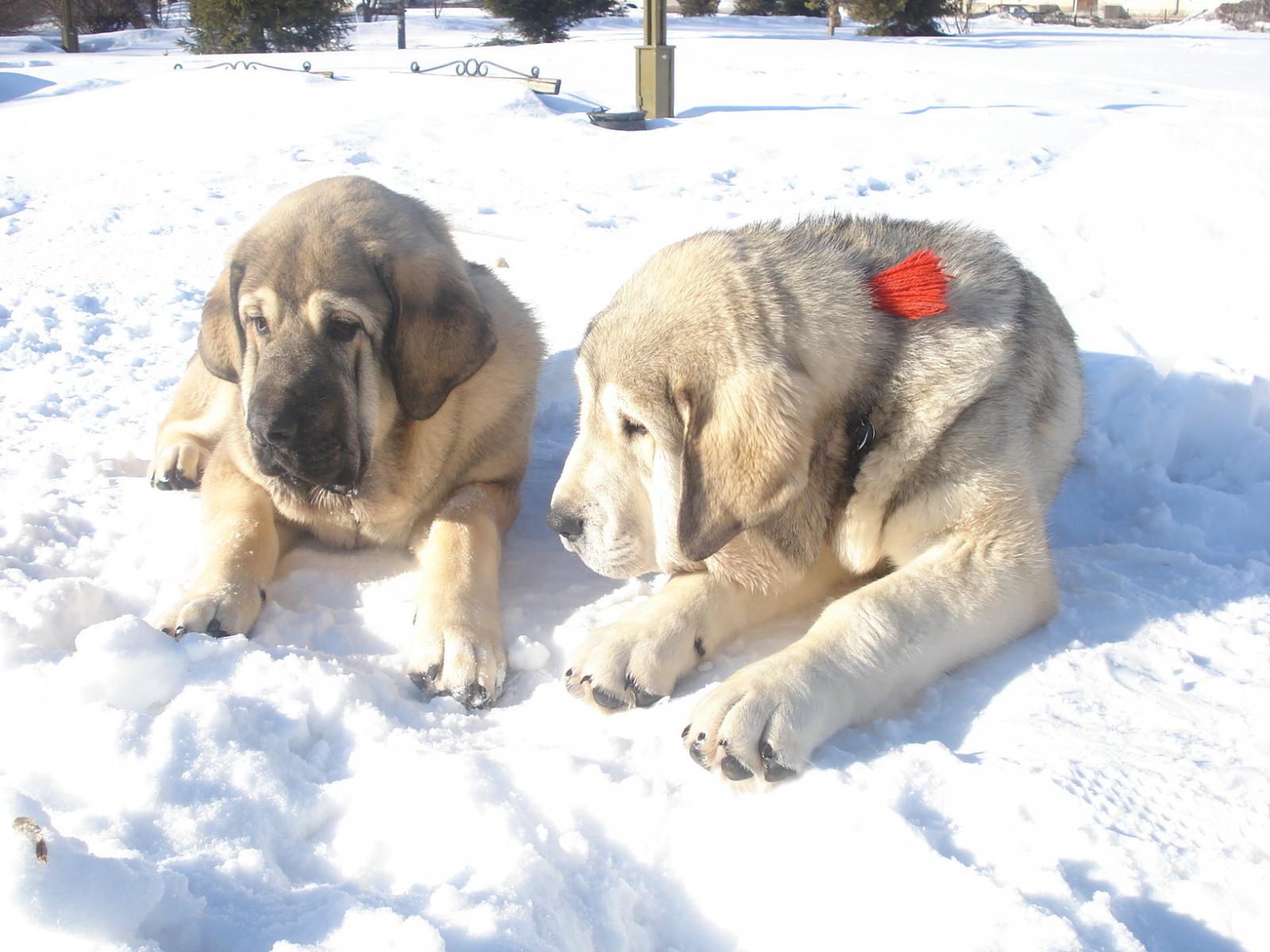 Обои Маленькие испанские мастифы на снегу