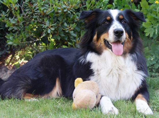 Обои Австралийская овчарка с игрушкой