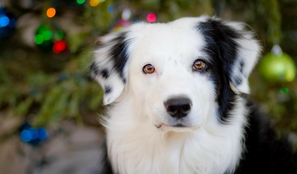 Обои Австралийская овчарка возле новогодней елки